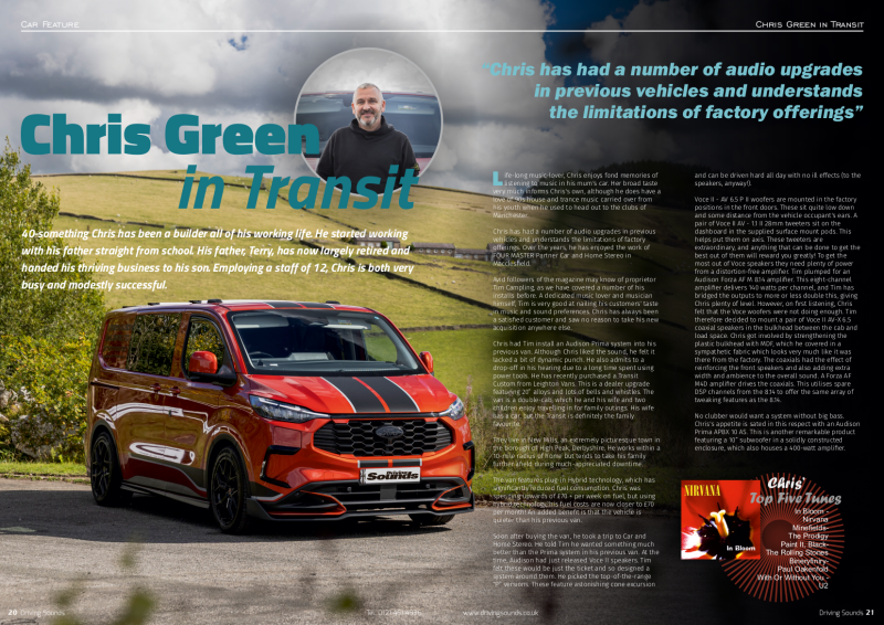 Chris had Tim install an Audison Prima system into his previous van. Although Chris liked the sound, he felt it lacked a bit of dynamic punch. He also admits to a drop-off in his hearing due to a long time spent using power tools. He has recently purchased a Transit Custom from Leighton Vans. This is a dealer upgrade featuring 20” alloys and lots of bells and whistles. The van is a double-cab, which he and his wife and two children enjoy travelling in for family outings. His wife has a car, but the Transit is definitely the family favourite.