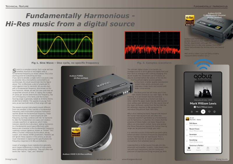 Listening from a Hi-Res source through a Hi-Res processor and amplifier is joyful. I have heard many cars with such equipment, and the clarity and precision of reproduction bring me great joy. Both Audison and Hertz now provide equipment that meets the JAS requirement, although the Audison Voce II is the only speaker from either brand that achieves the journey up to and beyond 40kHz.