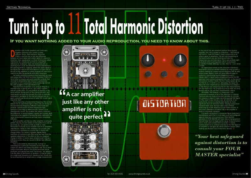 An organisation known as the Consumer Electronics Association (CEA) has worked tirelessly to come up with a uniform method for measuring and reporting THD. As with output power (Watts), there are many different ways to measure it (see Driving Sounds Magazine Issue IV – “What’s Watt”). A good audio company will quote the CEA approved measurement alongside their own. In the case of the Audison Quattro it looks like this: Output power @ 4Ω, 1% THD+N, 14.4 V: 120 W x 4 Ch. Ultimately, the lower the figure the more impressed you should be but as always it is vital that you are comparing like-for-like measurements. CEA membership is not compulsory and so there are many devices that do not use their measurement criteria.